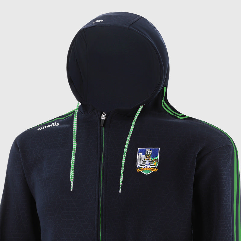Discover the O’Neills Limerick GAA Men's Fleece Full Zip Hoodie Marine. Crafted from moisture-wicking tech fleece, this full zip hoodie offers breathable warmth without the bulk, keeping you dry and comfortable in cooler conditions. The embossed pattern woven into the fabric adds a subtle yet premium texture, while the stripe detail down the sleeves delivers a bold, athletic finish. The adjustable drawstring hood provides personalised coverage, and two open front pockets offer quick-access storage or a place to warm your hands between sessions. Whether you're training or supporting from the stands, this hoodie combines function, style, and county pride in one essential layer.